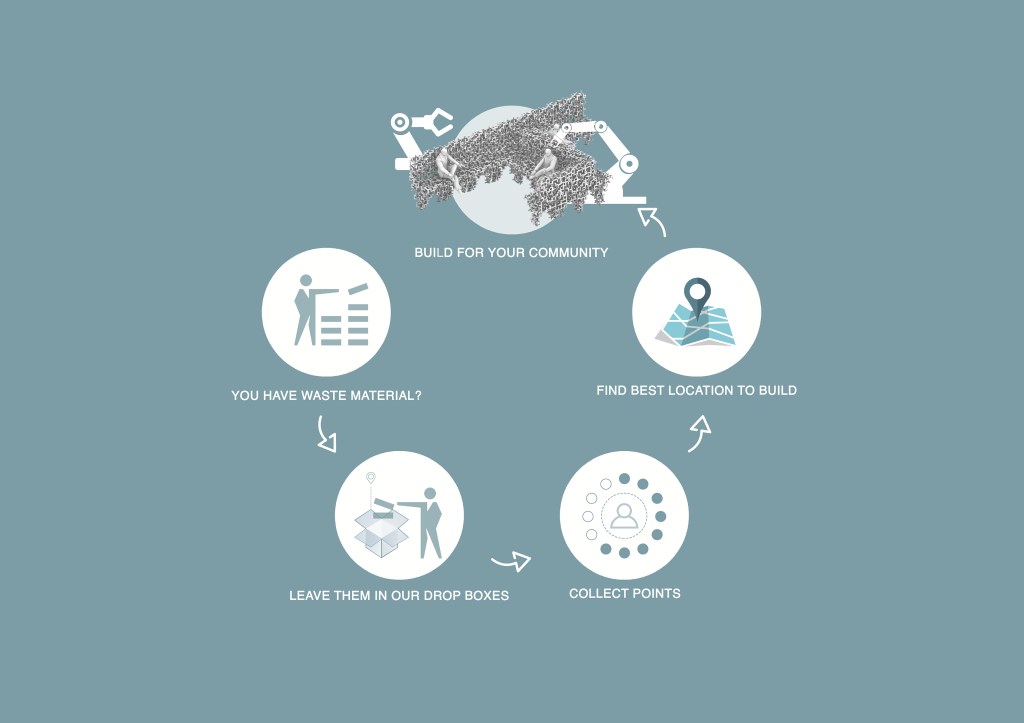 The main aim is to create a platform where people get rid of their spare/waste materials within “drop boxes” located around the city, allowing the possibility for designers to build from the waste material that has been placed their.