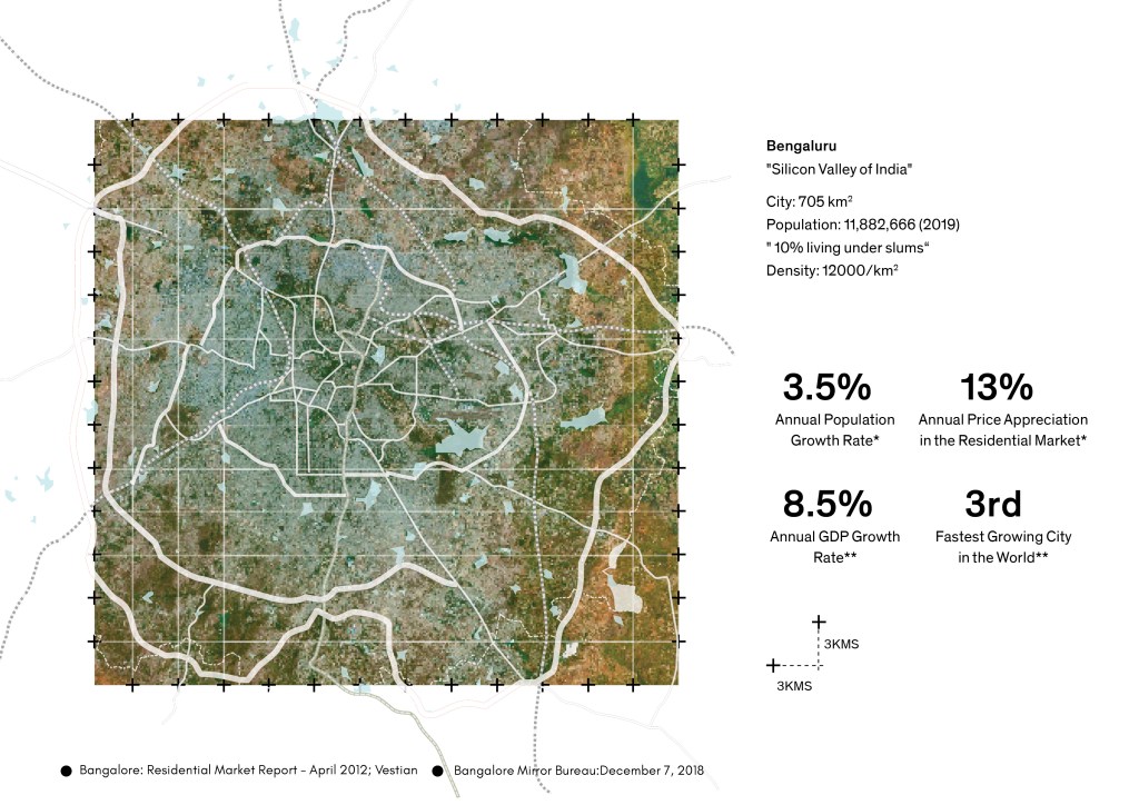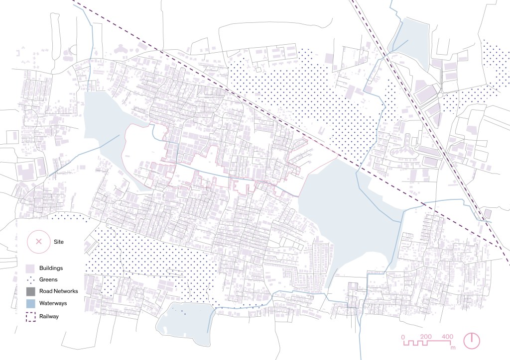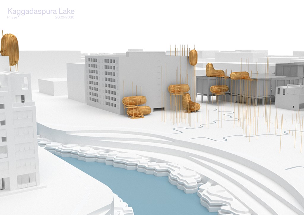 The site is alongside a narrow stream between two dried up lakes Kaggadaspura and Doddanekundi in the city of Bengaluru. The location provides huge potential to explore the new water based economy proposals for our cities of the future.