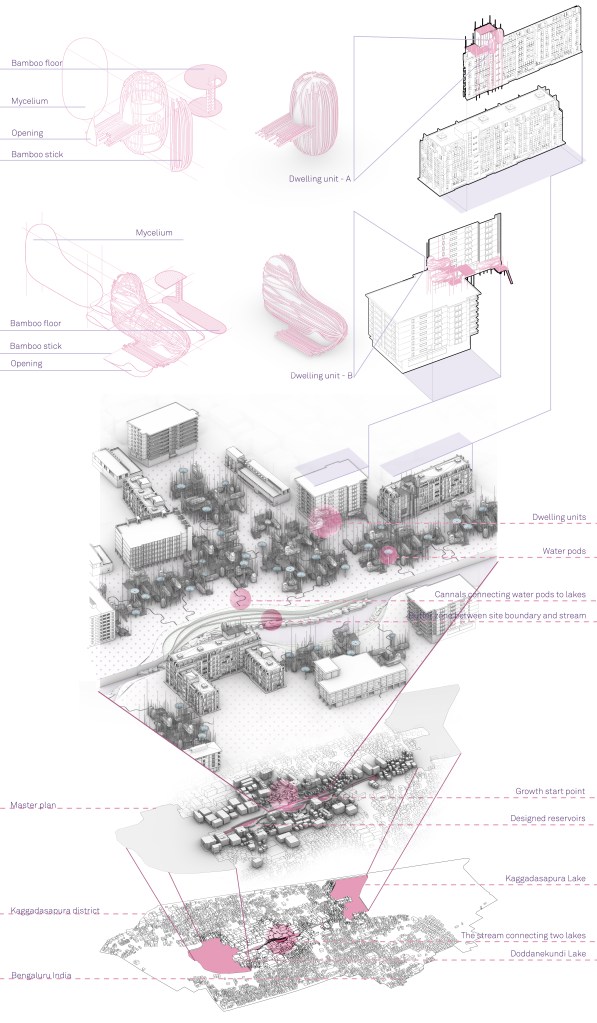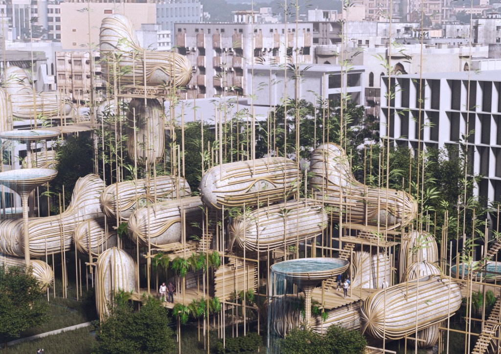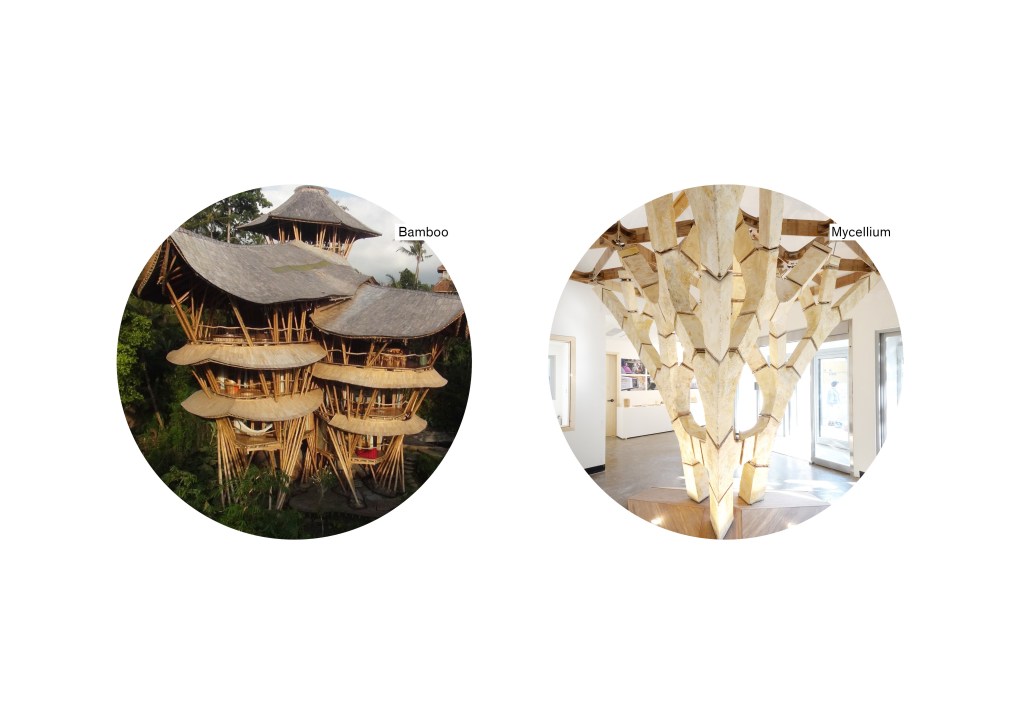 The research focuses on two key sustainable materials of the future Bamboo and Mycellium. There is an immense potential here as being nature based they can have negligible carbon footprint in our cities. Bamboo has two times the compressive strength as to that of concrete also being able to regulate indoor temperatures and block UV Rays. Mycellium on the other hand can be produced by mixing with the food waste and hence can be grown with the kitchen waste at homes, and has the ability to grow by itself – a property yet to be explored by the construction industry of today.